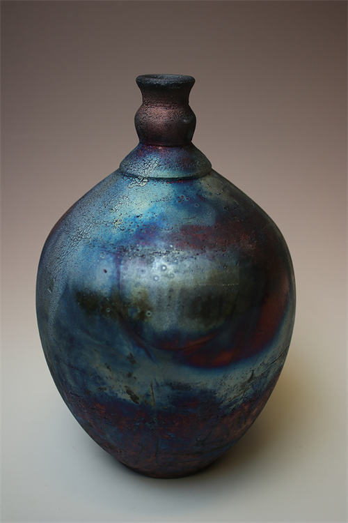 | Description: | Raku fired bottle with a Rainbow Sand Glaze. |