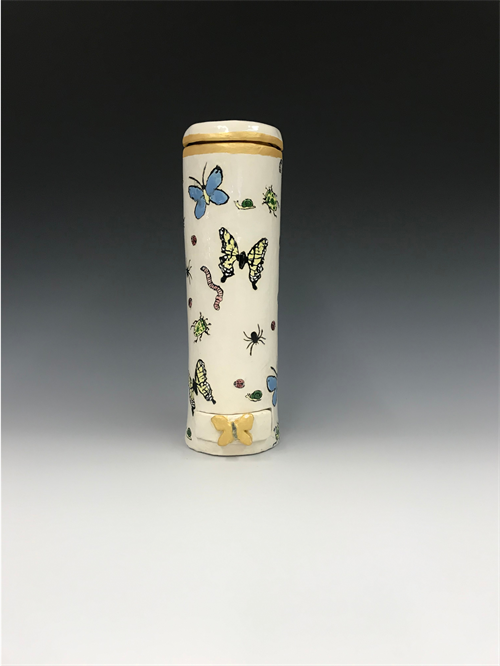 | Description: | When presented with the parameters of making a simple cookie jar, I took the opportunity to elevate the form with intricate details. Through the use of insects, I was able to practice sketching the shapes, measuring to ensure the repeated images were identical, and make my first attempt at underglaze transfer. |