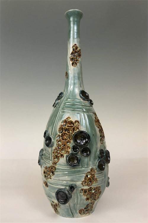 | Description: | This piece is covered in clay that looks like warts and fungus. I threw a vase and then sculpted out lines and circles and added on fungus like circles. The sculpted parts of the vase look like fungus, which some people may think is ugly, clay has taught me that there’s beauty in imperfection. |