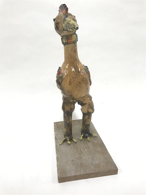 | Description: | This was built using pinch pot method to create the head and body. The legs and neck were extruded and later connected to form the figure of the chicken. |