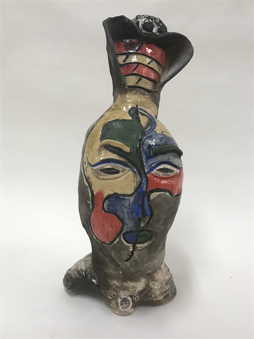 | Description: | This was a slab built piece using an Armature to assist with temporary support. Coil building was also used to create the base. The surface treatment was low fired glazes and then later smoke fired to give it a primitive look. |