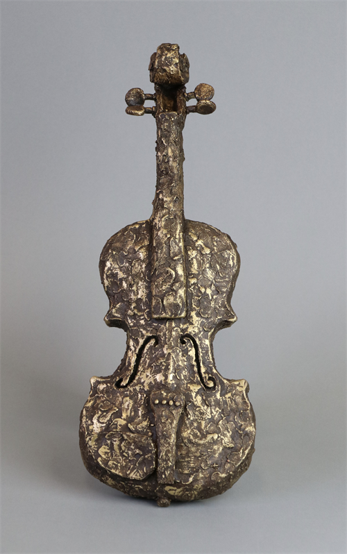 Description: This hand-sculpted stoneware violin was finished in an artificial bronze patina. While the proportion of this slightly scaled-down violin are very accurate, the details and texture were modeled with an expressive and textural approach.This piece represents the timelessness of the human connection with music. Some of most valuable instruments (still in use today even) are very old, and brand-new instruments are made very much the same way. Fired stoneware is one of the most durable and lasting materials available to human artistry, and the surface representing aged bronze further connects to ancient humanity.
